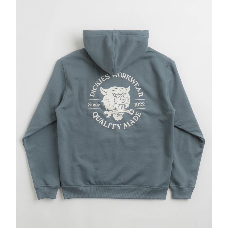 Dickies Wrench Hoodie in Stormy Weather. Relaxed fitting and made from a cotton-PES blend, this Dickies hoodie is designed with a brushed fleece lining. Featuring an adjustable drawstring hood, ribbed cuffs and a kangaroo front pocket, this blue grey Dickies hoodie is finished with a woven elastic hem and printed graphics.