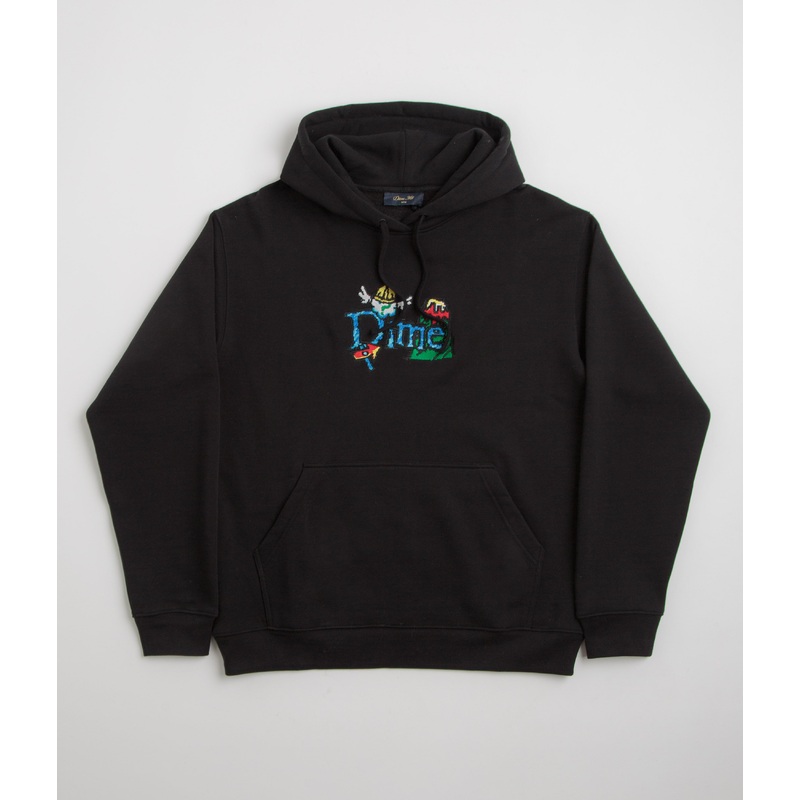 Dime Classic Fuzzy Hoodie in Black. Made from a midweight cotton-polyester blend, this block tone Dime hoodie is designed with an adjustable drawcord hood. Featuring ribbed cuffs and a kangaroo front pocket, this black Dime hoodie is finished with an embroidered centre chest graphic.