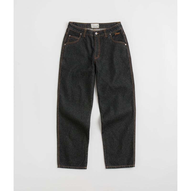 Dime Classic Relaxed Jeans in Black Washed. Tailored to a relaxed fitting with a tapered leg, these Dime jeans are made from 100% cotton denim. Featuring contrast stitching, a belt loop waist and a zippered fly, these washed black Dime jeans are finished with two front pockets, a coin pocket, wavy rear pockets, embroidered logo branding and a woven rear belt patch.