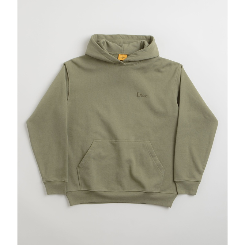 DescriptionDime Classic Small Logo HoodieDime Classic Small Logo Hoodie in Warm Khaki. Made from 100% heavyweight cotton, this block tone Dime hoodie is designed with a split panel hood. Featuring ribbed cuffs and a kangaroo front pocket, this khaki green