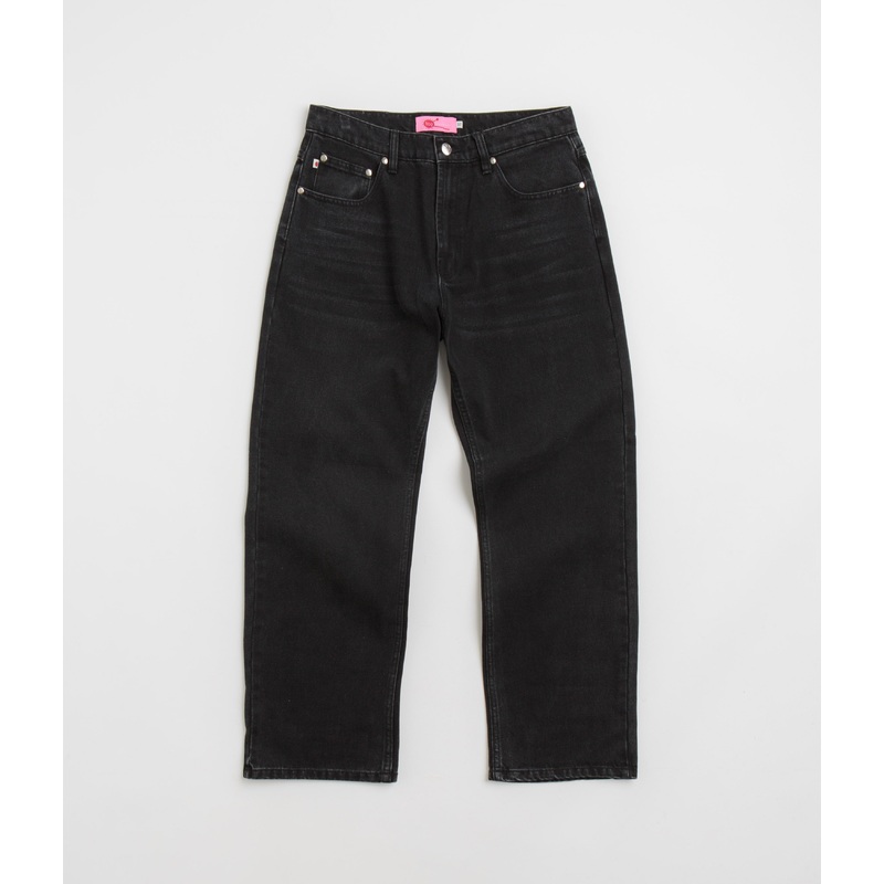 Frog Relaxed Fit Bootcut Jeans in Black. 90s inspired with a bootleg cut, these relaxed fitting Frog jeans are made from 100% cotton denim. Featuring a belt loop waist, a single button secured zipper fly and a 19.5 leg opening, these black Frog jeans are finished with four classic pockets, a single coin pocket and with woven flag label branding.