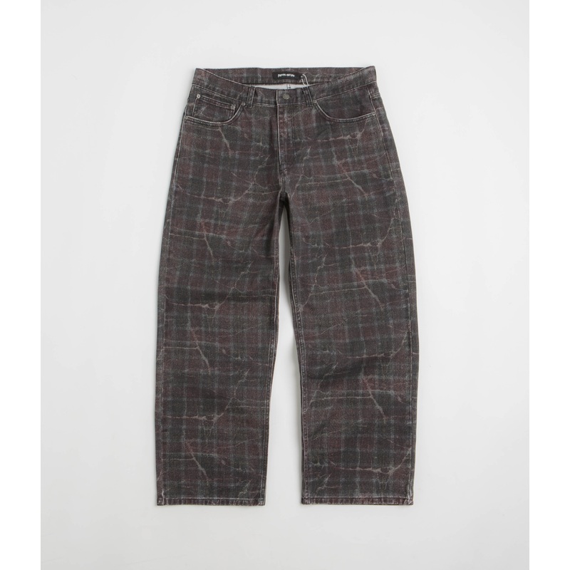 Fucking Awesome Distressed Plaid Fecke Jeans in Plaid. Designed with an all-over plaid pattern, these wide cut Fucking Awesome jeans are made from 100% Turkish cotton denim. Featuring a belt loop waist, a zippered fly, four classic pocket and a single coin pocket, these burgundy Fucking Awesome pants are finished with custom rivet detailing and a leather printed drip logo.