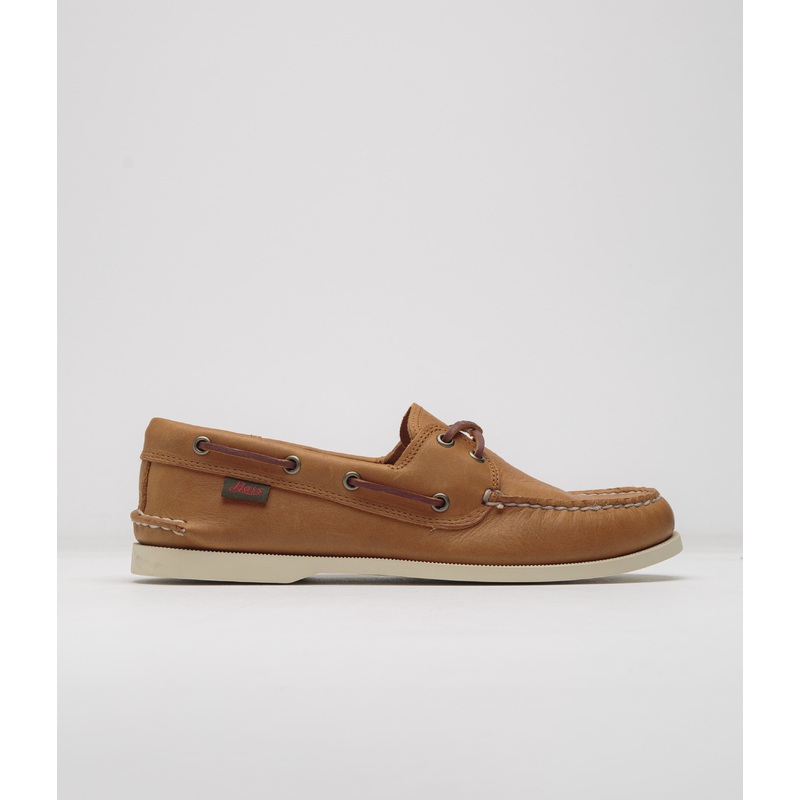 G.H. Bass Jetty III 2 Eye Boater Shoes in Brown. A nautical silhouette with a rubber sole, this G.H. Bass Jetty III is designed with suede uppers and a two-eye lace up closure. Featuring an EVA footbed, hand-stitched seams in waxed thread and brass metal eyelets, this brown G.H. Bass Jerry boater is finished with woven flag label detailing and with a natural leather sockliner.