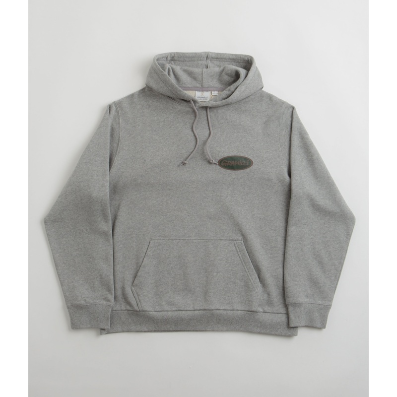 Gramicci Gramicci Oval Hoodie in Heather. Part of the brands latest release, this relaxed fitting Gramicci hoodie is styled with unisex sizing. Featuring a drawstring hood, ribbed cuffs and a woven elastic hem, this grey Gramicci hoodie is finished with a kangaroo front pocket and with printed front and rear graphics.