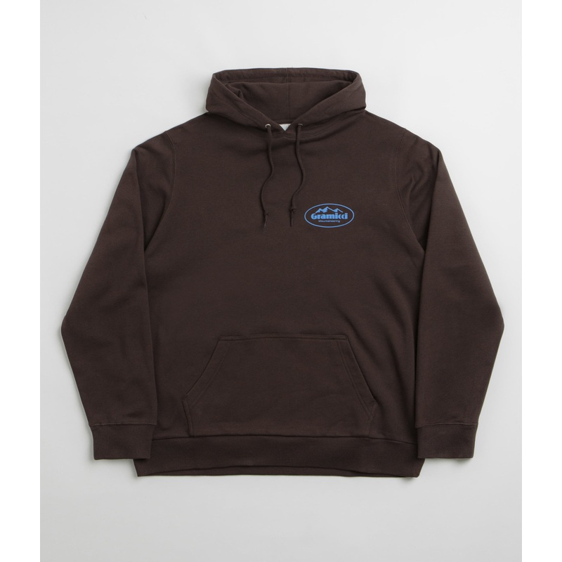 Gramicci Mountaineering Hoodie in Dark Brown. Regular fitting and made from 100% cotton jersey, this Gramicci hoodie is styled with an adjustable drawstring hood. Finished in a shade of dark brown with ribbed cuffs, a kangaroo front pocket and with printed front and rear graphics.