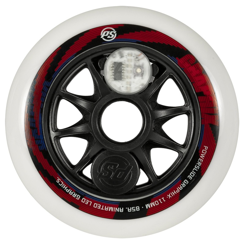 The future is now, and the future is bright. These new Powerslide Graphix 110 Multi-color LED wheels will light up your ride, but only when you want to. Simply switch the lights on and off by pressing the LED module, clipped into the specially designed Graphix core. The battery is rechargeable thanks to the Micro-USB port (cable not included). Forget about standard LED wheels which spin slow due to high magnetic rolling resistance. Graphix wheels score high with their outstanding look and top skating performance. This wheel comes in 110mm diameter and 85A hardness. Its bright shining with changing colors and showing multiple, changing graphics and texts. Join the Graphix revolution now.