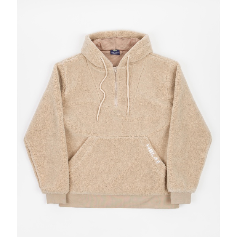 Helas Lou Hoodie in Beige. A highly insulated long sleeve silhouette from the brands latest W21 collection, this neutral toned Helas hoodie is crafted from a blend of 50.9% cotton and 49.1% polyester and tailored to a casual and relaxed fitting. Featuring a woven elastic waist, rib knit cuffs and a practical zip YKK fastening across the hooded neckline, this breathable mesh-lined hoodie is designed with the transitioning seasons in mind. A dual entry kangaroo pocket features white stitch embroidered Helas branding across the left opening, whilst exposed stitching reveals a mirrored neckline seam for additional textured depth and detail.