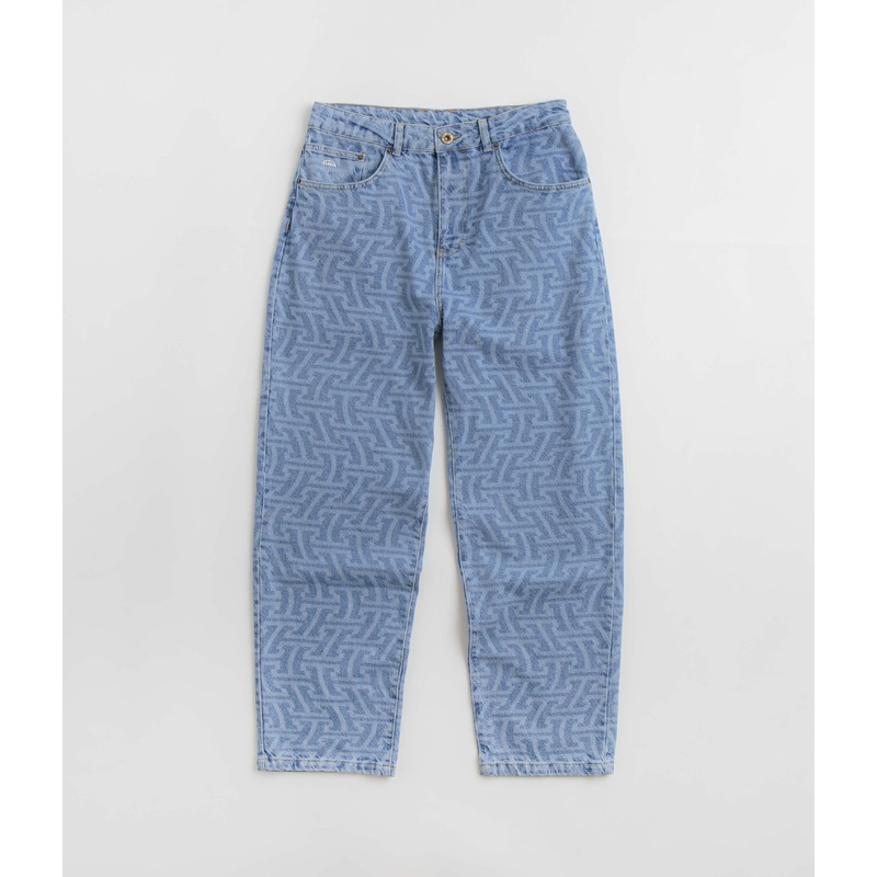 Hlas Wave Jeans in Light Blue. Tailored to a regular fitting with a slightly tapered leg, these Hlas jeans are made from 100% cotton denim. Featuring an all-over pattern print, a classic belt loop waist and a single button secured zipper fly, these blue denim Hlas jeans are finished with two front pockets, two rear pockets, an embroidered coin pocket and custom hardware.