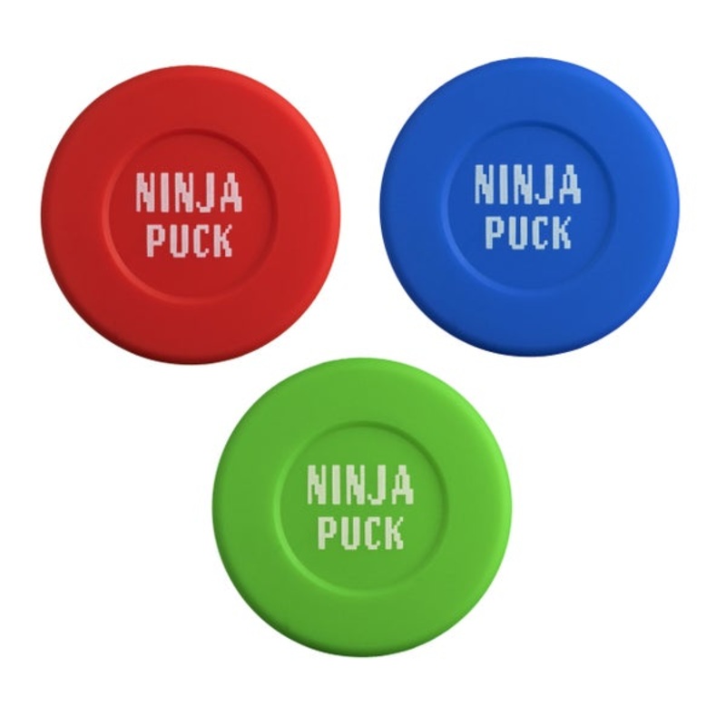 Three pack of hollow air filled practice pucks are for multi-surface hockey. The pucks are built to withstand the wear and tear of rough surfaces like driveways and streets. These pucks are ideal for indoor or outdoor use. Ninja Pucks are made with a non-marring material and they will not leave marks or dents on indoor floors or surfaces. The indented center of the puck reduces friction and helps maintain a smooth glide . Made with a durable PVC, Ninja Pucks are built to resist impacts and maintain their performance and form overtime. The 3 pack includes a green, blue and red hollow air filled multi-surface Ninja Puck.