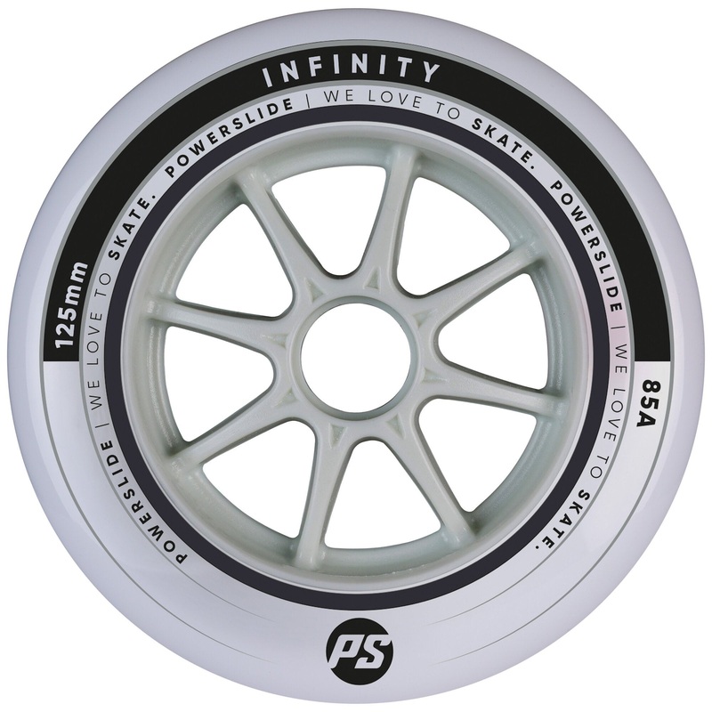 Powerslides Infinity 125 wheel is made with a focus on high-performance training and fitness skating. The Infinity wheels use Race Performance (RP) quality polyurethane (PU) for smooth and fast-rolling and long-lasting performance. A hardness of 85A is the