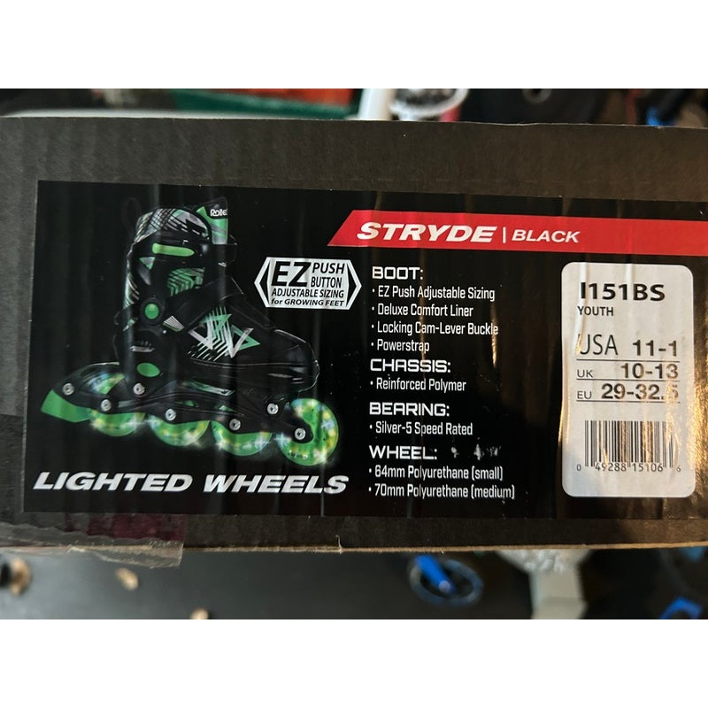 SpecificationsCategoryInline, Roller & Street Hockey > Inline SkatesBrandOtherAge Group YouthSkate Size 12.0Condition NewQuantity1 available|||Seller DescriptionBrand new in the box. Black and green.