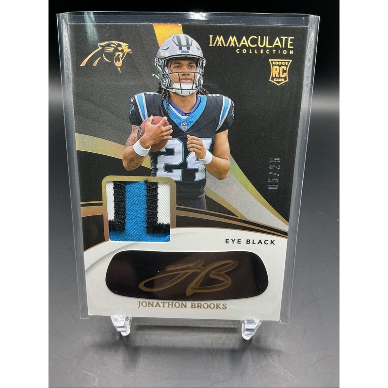 The product is a rare and highly sought-after 2024 Panini Immaculate Collection Eye Black Rookie Patch Autograph card featuring Jonathon Brooks of the National Football League (NFL). This card, numbered out of 25, is part of the Immaculate Signature Patche