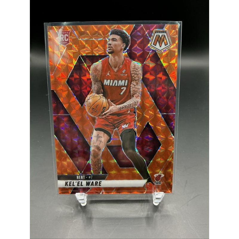 The product is a 2024-25 Panini Mosaic Orange Mosaic Prizm #232 SP RC trading card featuring Kel’el Ware. This basketball card is a rare short print, limited to just 249 copies, making it highly sought after by collectors. With the reputable Panini manufacturer and quality Mosaic Prizm parallel, this card is sure to be a prized addition to any sports trading card collection.