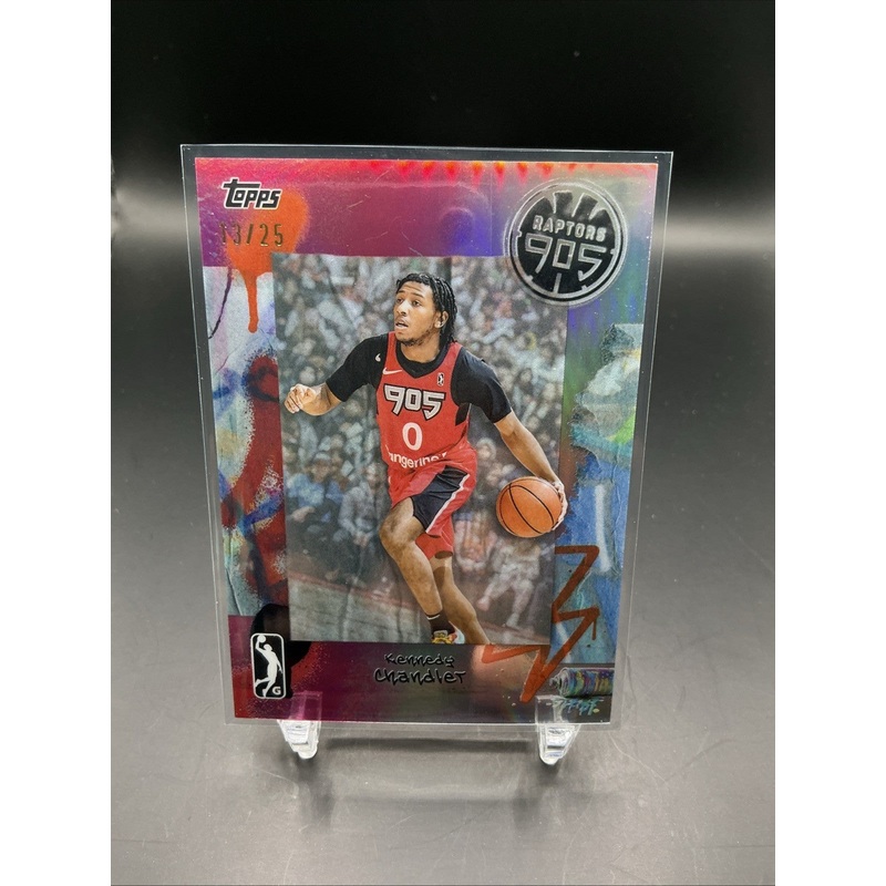 The product is a KENNEDY CHANDLER 2024-25 Topps G League Chrome Pink #BV-36 trading card featuring the basketball player Kennedy Chandler. This original card manufactured by Topps showcases the player in his Raptors team, with a limited print run of only 25 cards. Measuring at 4″ x 3″, this sports trading card is a collectible item for fans of basketball and the G League.