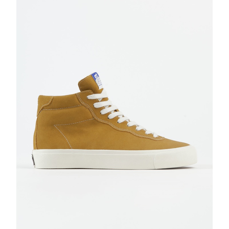 Last Resort AB VM001 Hi Shoes in Mustard Yellow. A striking variation on the staple Last Resort AB VM011 Hi, this mustard yellow edition has durable brushed suede uppers, a full length 100% cotton lacing system and custom features catered specifically towards skateboarders. With minimal detailing but great attention to comfort, durability and unisex styling, the uppers have a smooth, high quality finish with stylised stitching around the collar and a double stitched ripple-effect laces border. Helping to keep the foot securely in place during demanding skate sessions, the cotton lacing system sits on top of a lightweight tongue that has been shaped to wrap around the front of the foot, complete with a two tone branded label around its top edge. The padded PU collar will soften further over time and embossed Break Free lettering presents one of the brands key taglines, split across the back of either heel. Throughout the inside of the shoe a lightweight fabric lining has been added and sits alongside a custom branded insole whilst on the outside of the shoe the rubber sole is strengthened by a matching tone foxing tape line. Completing the design, a grip and stability focused pattern with angled shapes that wont collect gravel.