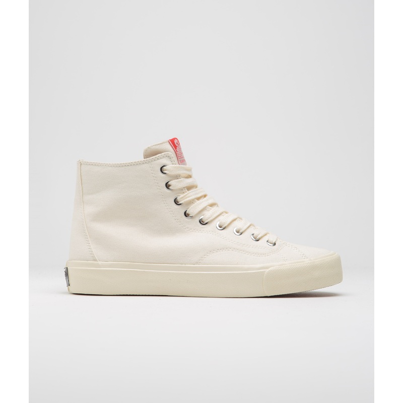 Last Resort AB VM003 Canvas Hi Shoes in White. Seen here in an all-white colourway, the Last Resort AB VM003 is a vegan-friendly skate shoe styled with canvas uppers and a breathable canvas lined interior. Featuring an un-padded PU collar and built-in rubber reinforcements within the toe box and side walls, this high collar Last Resort AB sneaker also features a white rubber outsole, tonal foxings and a textured toe bumper. The custom designed gum rubber outsole features a multi-traction tread, whilst flat cotton laces secure the flag labelled tongue in place. Finished with printed insoles, metal eyelets and with Last Resort AB rubber heel scabs.