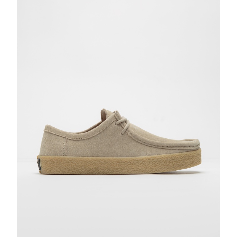Last Resort AB VM006 Moc Shoes in Sand and Gum. Drawing inspiration from classic moccasin styles, this canvas lined Last Resort AB VM006 is designed with suede uppers and deep-stitch details. Finished in beige with a textured midsole, a gum rubber outsole, pritnted insoles and a Last Resort AB heel plate.