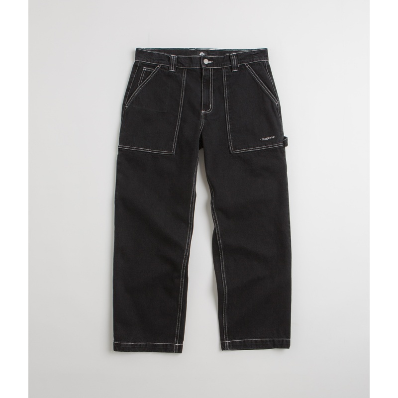 Magenta Atelier Jeans in Black. Styled with a slightly tapered leg and a semi-baggy fit, these Magenta pants are made from 100% cotton denim. Featuring an elasticated rear waistband, a zippered fly and contrast stitching, these black Magenta pants are finished with four pockets, an embroidered logo, a woven hammer loop, additional utility pockets and woven flag label branding.