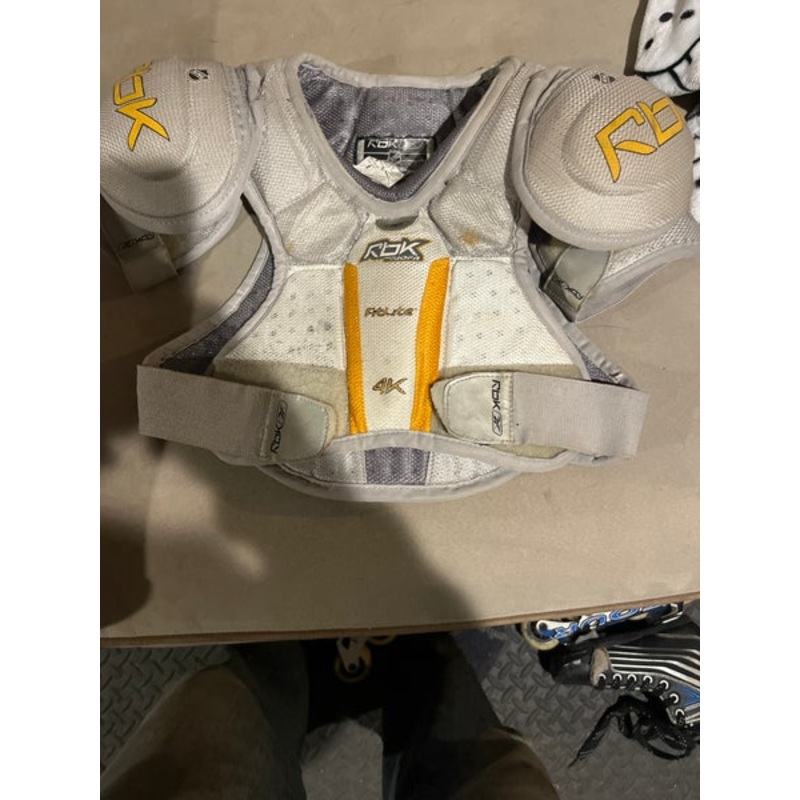 SpecificationsCategoryHockey > Protective > Shoulder PadsBrandReebokModel4KSize Medium/LargeGender Men'sAge Group YouthCondition UsedPro Stock Pro StockQuantity1 available|||Seller DescriptionThe RBK Shoulder Pads are a junior small/medium or si