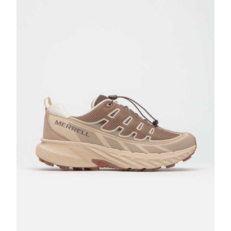 Merrell Agility Peak 5 SE Shoes in Hazel. Inspired by the original trail runner, this Merrell Agility Peak 5 SE is designed with TPU and engineered mesh uppers with leather details. Featuring a 100% recycled mesh lining, a toggle-cord lacing system and a removable EVA footbed, this brown beige Merrell Agility Peak 5 SE also features FoatPro midsole. Finished with a Vibram MegaGrip, a Vibram tread, printed branding and woven heel pull tabs.