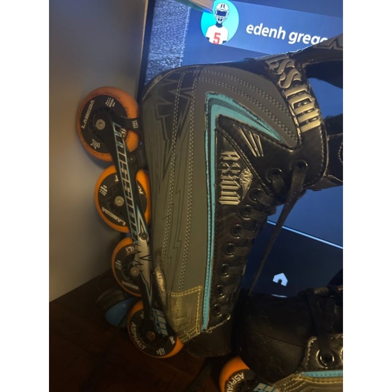 SpecificationsCategoryHockey > Inline, Roller & Street > Inline SkatesBrandMissionModelAxiom A4Skate Width D&R (Regular)Condition UsedAge Group JuniorSkate Size 9.0Quantity1 available|||Seller DescriptionUsed but basically new , labeda wheels