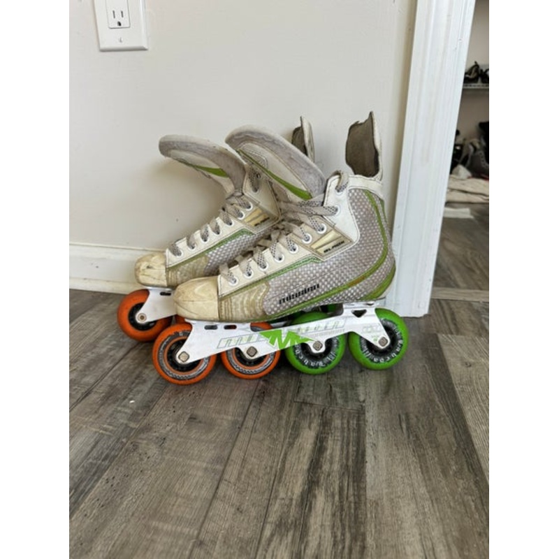 Used Boss Black roller hockey skates in very good condition. Size 6. A little dirty because they were used outdoors but no damage or wear on the skate boot or chassis.