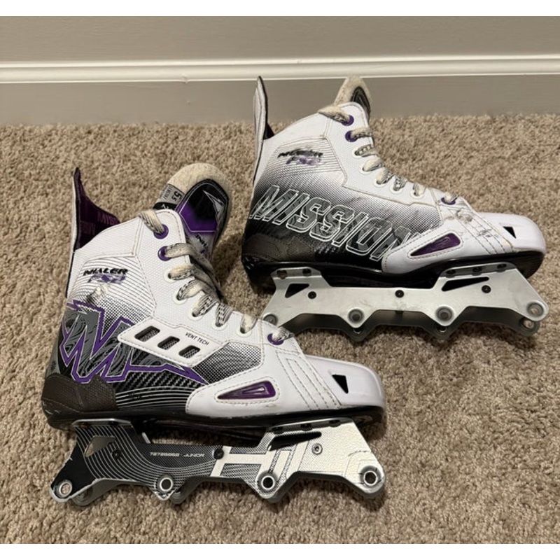 SpecificationsCategoryHockey > Inline, Roller & Street > Inline SkatesBrandMissionSkate Width UnknownCondition UsedAge Group JuniorSkate Size 5.5Quantity1 available|||Seller DescriptionUsed for a few months. Has some wear cosmetically(shown in pi