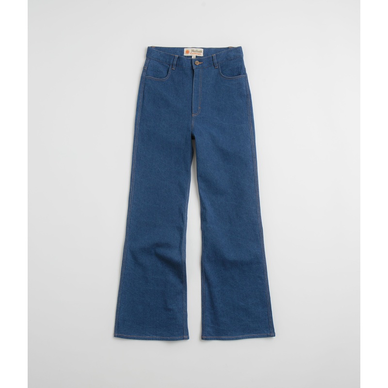 DescriptionMollusk Womens Bella JeansMollusk Womens Bella Jeans in Dark Indigo. High waisted and styled with a long, flared leg, these Mollusk jeans are made from a cotton-spandex blend. Featuring a single button secured zipper fly and contrast stitching,