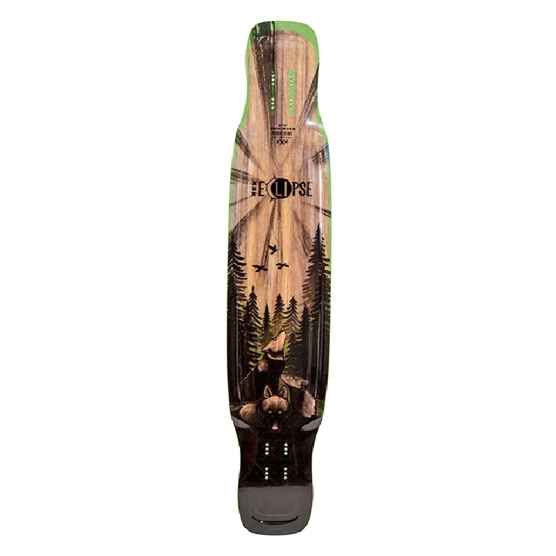 In addition to the bomber two-ply vertically laminated wood core, the 100% waterproof Eclipse is reinforced with fiberglass and carbon fiber patches in the neck to give the board consistent flex, torsional stability and strength under foot – important factors for a board of its length.