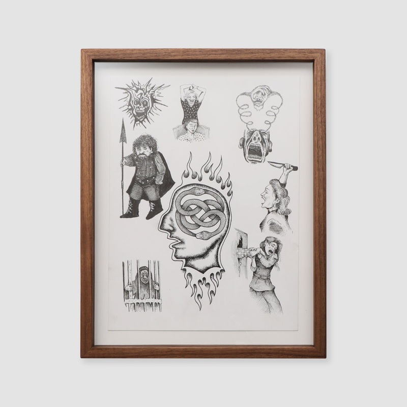 Mike Lottie Gigliottis artworks. Frames by Josh Pall.While Lotties practice has touched on painting, pottery, and watercolour, this exhibition returns to his roots, black ink pen on paper."Growing up, I was lucky to have parents who at one time owned a chi