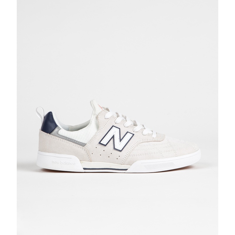 New Balance Numeric 288 Shoes in Off White and White. Inspired by 90s courtside favourites and styled in a neutral colourway, the New Balance Numeric is designed with an improved fit and a streamlined construction. Featuring off-white suede uppers with an internal mesh bootie and an OrthoLite insole, this low collar New Balance Numeric skate shoe also features a C-Cap midsole and a gum rubber outsole. A multi-traction underfoot tread provides exemplary grip, whilst the two tone N logo side walls feature perforated details for increased airflow. Reinforced toe box stitchings pay homage to vintage court shoes, whilst the flat laces secure the one-piece mesh tongue in place. Finished with printed NB# 288 tongue tabs, printed insoles and with navy heel patches that feature reflective strip pull tabs.
