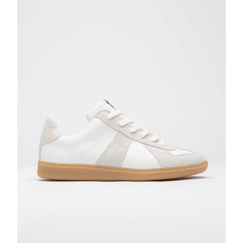 DescriptionNovesta All Leather German Army Trainer ShoesPulling from archival 80s designs, the Novesta German Army Trainer comes in white with a natural leather upper and suede overlays for a clean, durable feel. Removable printed insoles, a moulded midsol