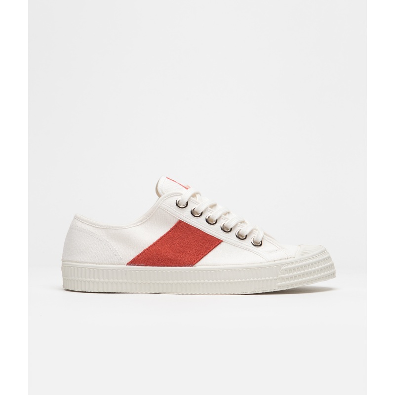 Novesta Star Master Shoes in 10 White, Red and 110 White. Designed with contrast suede stripe detailing, this Novesta Star Master is styled with 100% cotton uppers. Vegan friendly and handmade with a reinforced rubber toe and a tire-mark midsole, this white and red Novesta Star Master is finished with a pressed rubber outsole, metal eyelets, printed anatomically shaped insoles and with woven Novesta flag labels.