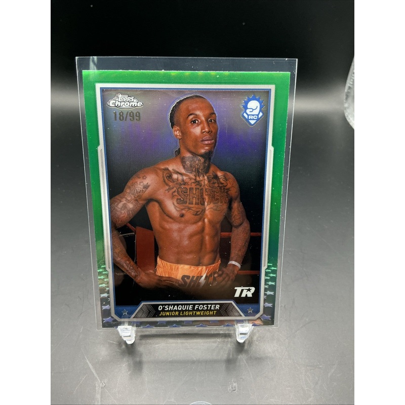 The product is a 2024 Topps Chrome Boxing RC #40 Green Refractor /99 Rookie trading card featuring OShaquie Foster. This sports trading card is a highly sought-after collectible item for boxing fans and collectors alike. The limited print run of only 99 ca
