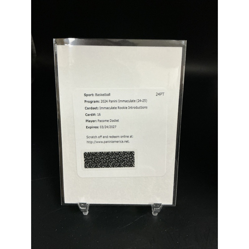 The product is a Pacome Dadiet 2024-25 Panini Immaculate Collection rookie autographed trading card from the National Basketball Association (NBA). This original card is part of the Immaculate Collection set by Panini and features the player’s signature, making it a valuable collectible for basketball fans.