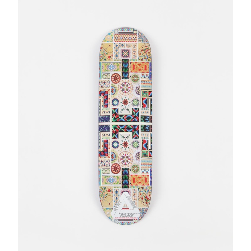 Palace Chewy Pro S25 Deck in 8.375. A mosaic-inspired new-season deck from team rider Chewy Cannon, this narrow-width 8.375 deck arrives as part of the brands latest SS21 hardware collection. Crafted from 100% 7-ply maple for an enduring and long-lasting sense of wear, this multi-tonal deck is signed off with a patterned full-colour underside with a symmetrical Eastern-style aesthetic and sleek crisp-white Chewy Cannon Palace Tri-Ferg branding across the tail-end of the board.