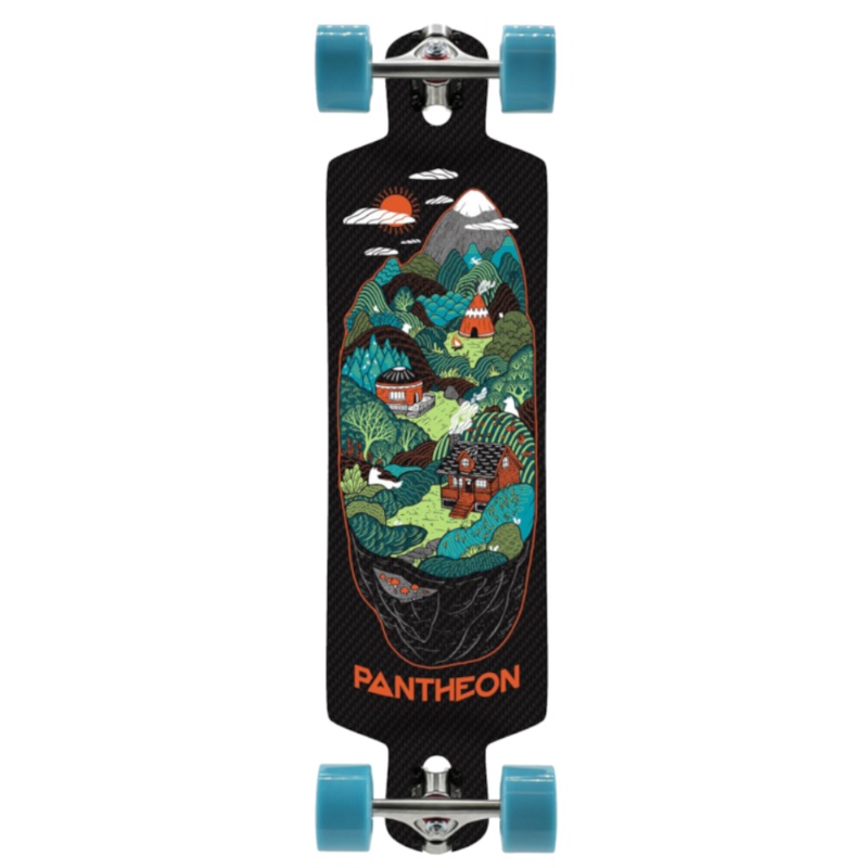 CURVACEOUS CONFIDENCE Pantheons highly functional crescent drop lowers the center of gravity and stiffens the drops for efficient pushing while also providing enhanced lateral support and general ergonomics. The drop also allows for effortless slide initiation to control speed in common settings like hilly urban environments or paths and trails. Mustache rocker profile combines subtle camber at the decks midpoint with rocker under the feet. The localized camber pairs with the slightly tapered waist to provide suspension characteristics while allowing the rest of the board to remain stiff for optimum control. Mellow radial concave provides an ideal balance of edge control and riding comfort. The junctions between concave and crescent drop create three-dimensional pockets for secure and intuitive ergonomics.