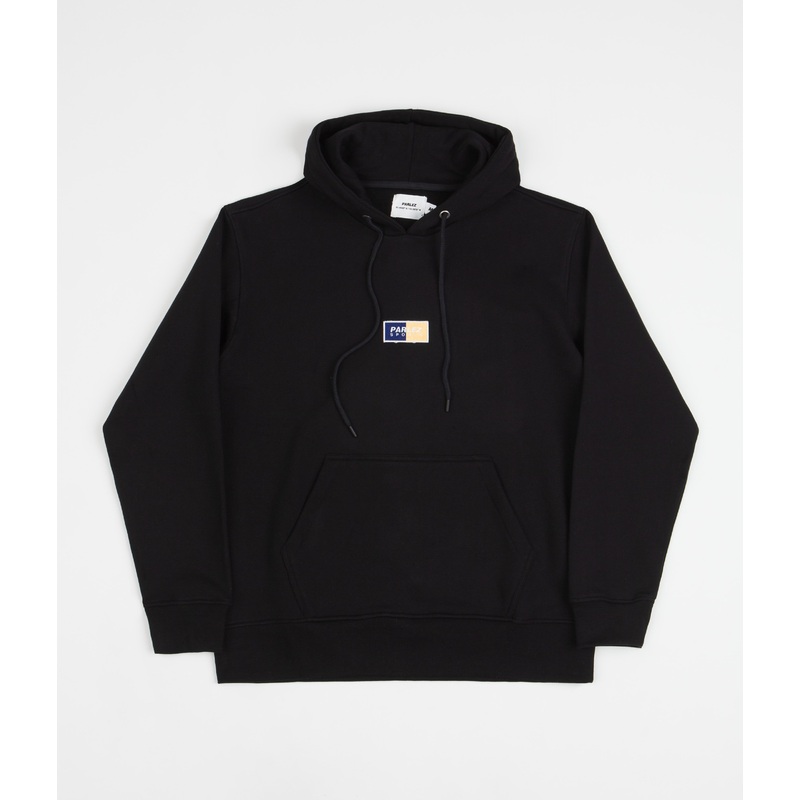 Parlez Kuff Hoodie in Black. Tailored to a regular fitting from a blend of 60% organic cotton and 40% recycled polyester, this long sleeve Parlez hoodie arrives as part of the brands latest collection. Styled with cuffed sleeves, a thick rib woven elastic hemline and a drawstring adjustable split panel hood, this black hoodie also features a classic dual entry kangaroo pocket. Finished with colour matched seams and with an embroidered Parlez brand patch across the upper chest.