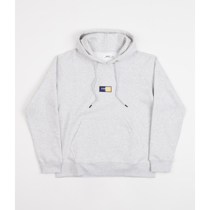 Parlez Kuff Hoodie in Heather. Inspired by vintage sportswear essentials, this colour block Parlez hoodie is tailored to a regular fitting from a blend of 60% organic cotton and 40% recycled polyester. Featuring a woven elastic hemline, cuffed sleeves and a split panel hood with tonal drawcords, this grey Parlez hoodie also features a dual entry kangaroo pocket across the waist. Finished with colour matched stitchings and with an embroidered Parlez brand patch sewn across the upper chest.