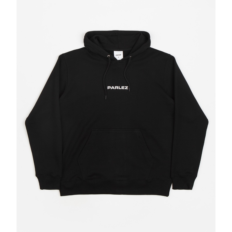 Parlez Laguna Hoodie in Black. Tailored to a regular fitting from a blend of organic and recycled cotton, this new season Parlez hoodie is styled with a drawstring hood, rib knit cuffs and a woven elastic hemline. Finished with a kangaroo front pocket, this black Parlez hoodie also features embroidered centre chest branding with additional printed Parlez Sports detailing on the reverse.