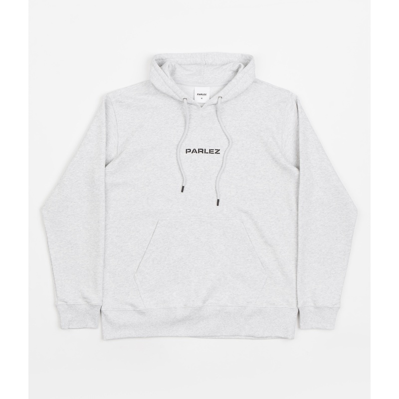 Parlez Laguna Hoodie in Heather. Part of the brands latest collection, this regular fitting Parlez hoodie is made from a blend of both organic and recycled cotton. Featuring a drawstring hood, rib knit cuffs and a woven elastic hemline, this heather grey Parlez hoodie is finished with a classic kangaroo front pocket, embroidered chest branding and with additional Parlez Sports branding printed on the reverse.