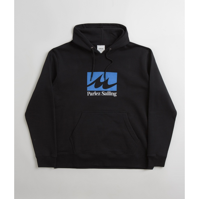 Parlez Lapstrake Hoodie in Black. 90s inspired and tailored to a regular fitting, this new season Parlez hoodie is made from 100% organic cotton. Featuring a drawstring hood, ribbed cuffs and a woven elastic hem, this black Parlez hoodie is finished with a kangaroo front pocket and a screen printed Parlez Sailing chest graphic.