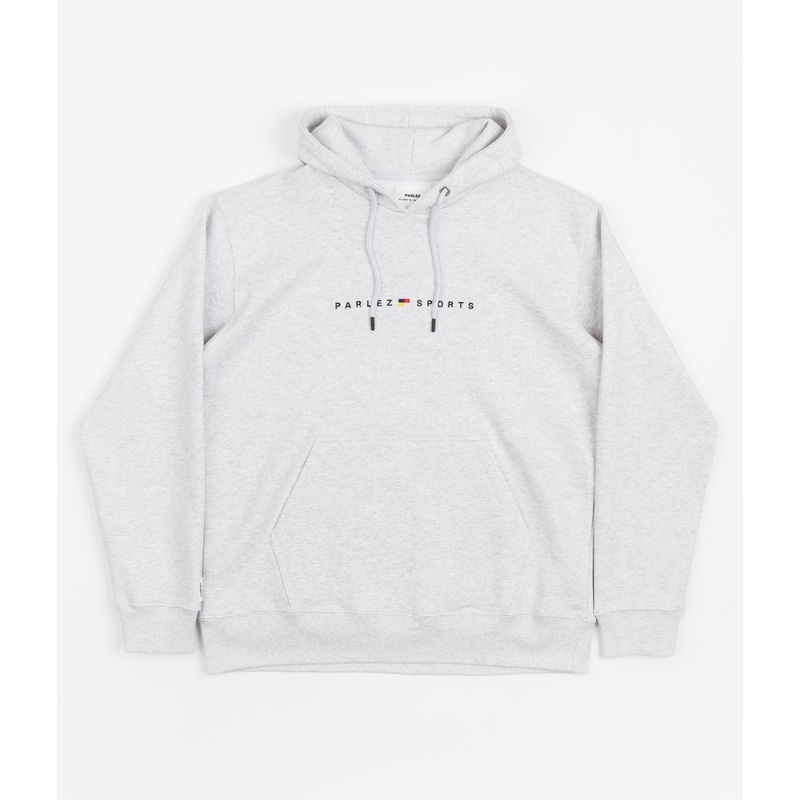 Parlez Standfast Hoodie in Heather. Tailored to a regular fitting and made from a blend of 50% recycled and 50% organic cotton, this brush lined Parlez hoodie arrives as part of the brands latest release. Styled with a split panel drawstring hood, cuffed sleeves and a rib knit hem, this heather grey Parlez hoodie is finished with a kangaroo front pocket and with embroidered Parlez Sports chest branding.