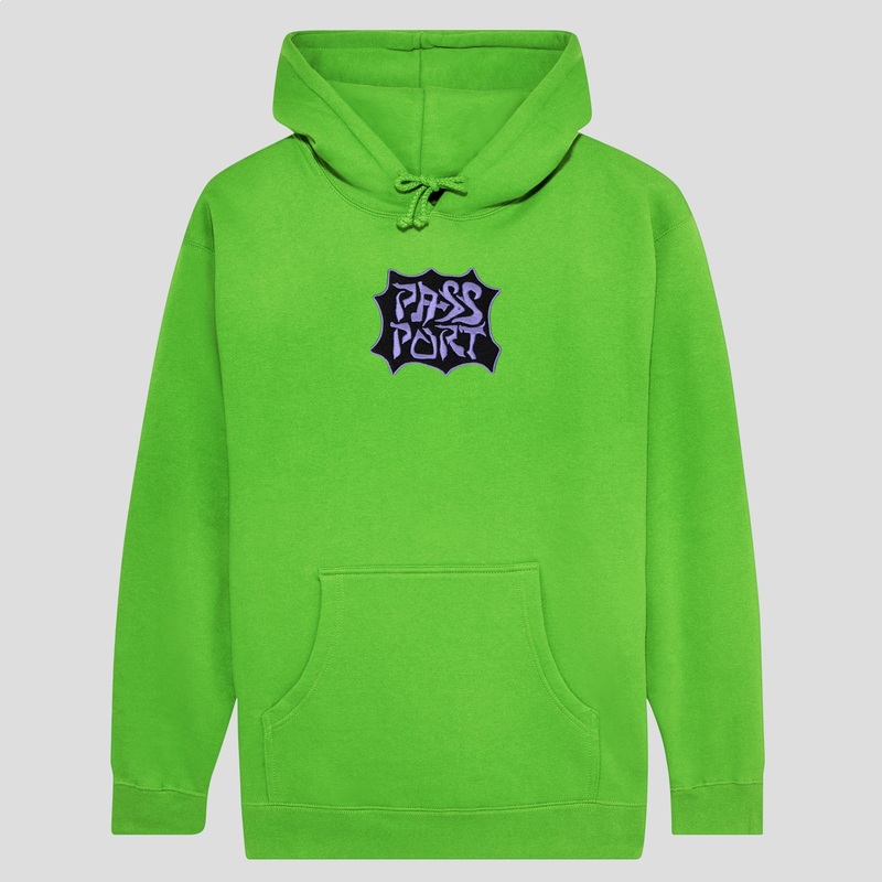 Pass~Port Glyph Hoodie in slime is part of range #45. The Pass~Port hood is made from a polyester / cotton blend and features direct embroidery on front, which is finished in the classic Pass~Port hoodie fit.
