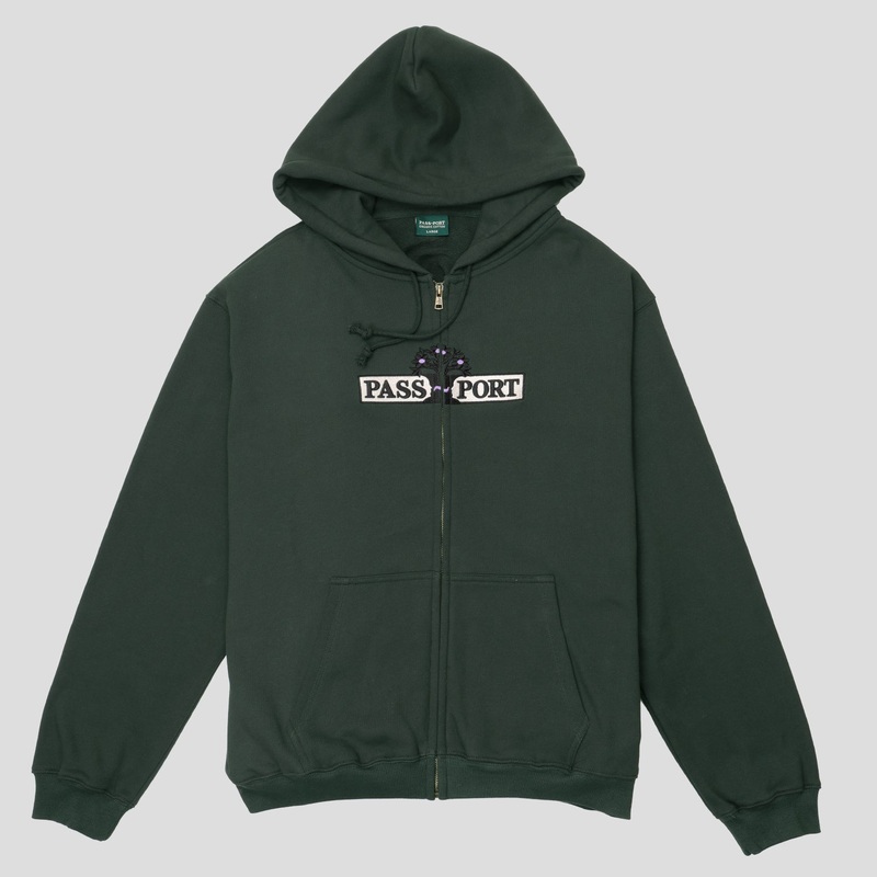 Pass~Port House Plant organic zip up hoodie in gumnut green from the organic department for range #42.The organic Pass~Port jumper is made from 100% organic cotton and features a direct embroidery on front and is finished in the classic Pass~Port hoodie fit.