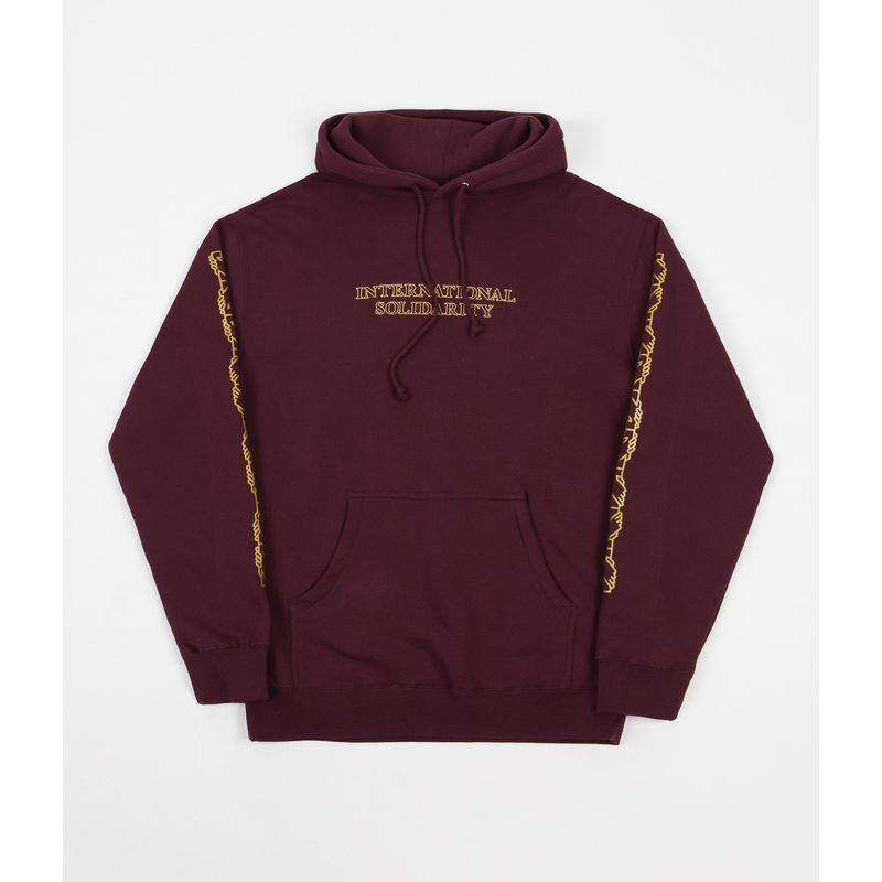 Seen here in a rich and warm hue of maroon red, this well-insulating Intersolid Hoodie from Pass Port boasts a humble appeal and an all-inclusive undertone thats set to complement any leisurely wardrobe with ease. Made from a soft and comfort-minded blend of 80% cotton and 20% polyester, this long sleeve hooded sweater is further defined by its cuffed sleeves, elasticated rib-knit hemline and its colour-blended drawcord fastenings that shadow the base of the deep set and split-panelled hood. A spacious kangaroo-style pocket can be found above the waist, marking the perfect stash-spot for essential items, whilst the golden chain-link interlocking hands across each sleeve and the shadow-style International Solidarity branding across the centre of the chest honours both the brands admiration for all-inclusive culture and their undying desire to bring people of all backgrounds together under one common roof.