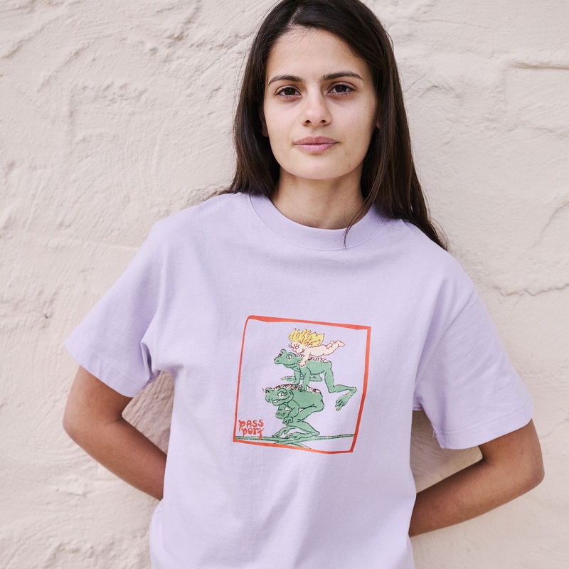 The Leap Frog tee in Lavender is made from 100% cotton and features a screen printed graphic on the front, finishing in the signature Pass-Port fit.