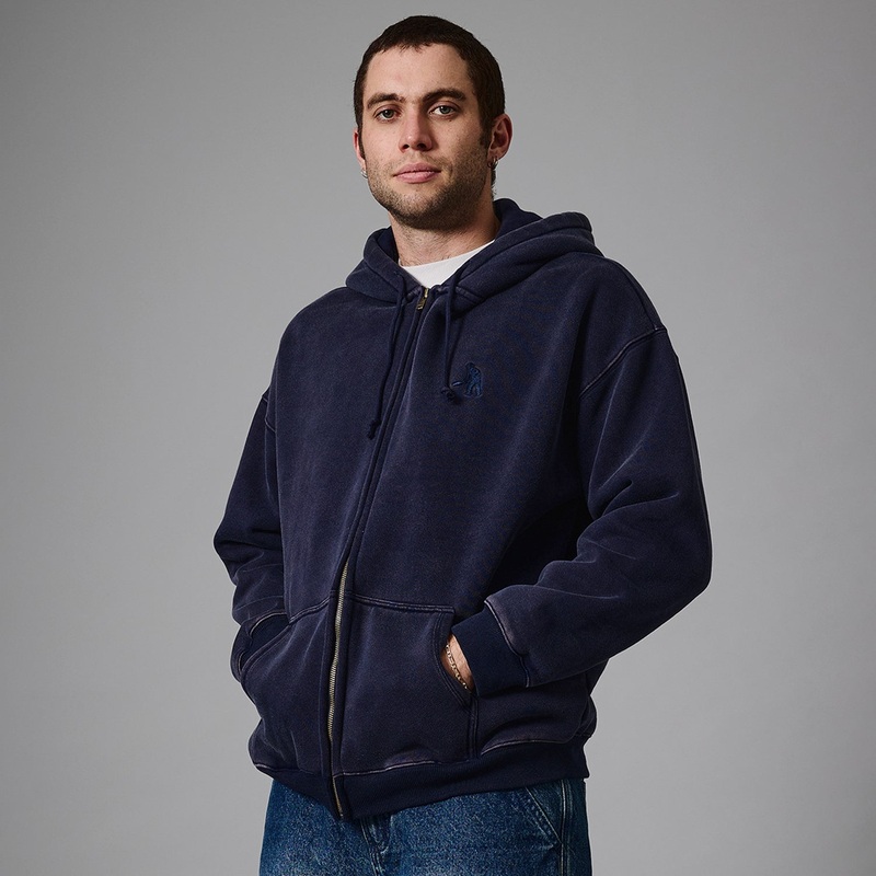 Pass~Port Solid Workers Zip hood in washed navy from range #46. Made from 380GSM Cotton Poly Blend. The Solid Workers Hoodie features a digger embroidery on chest and drawstring hood. Finished in a heavy weight fleece with an oversized boxy fit.380GSM Cott