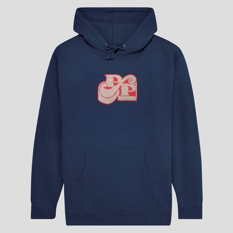 Pass~Port Tilde Stamp Hoodie in navy from range #42. ThePass~Port jumper is made from a cotton polyester blend and features embroidered chenille patch on front which is finished in the classic Pass~Port hood fit.Relaxed fitEmbroidered chenille patch70% cot