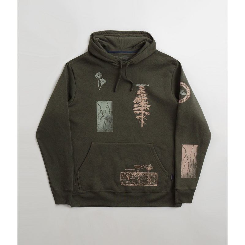 Patagonia Pyrophytes Uprisal Hoodie in Basin Green. Drawing creative inspiration from DIY photocopied zines and tattoo styles, this Fair Trade Certified Patagonia hoodie is tailored to a regular fitting with a drawstring hood. Featuring ribbed side panels, rib knit cuffs and a woven elastic hem, this green Patagonia hoodie is finished with a kangaroo front pocket, a woven P-6 flag label and all-over botanical print artwork.